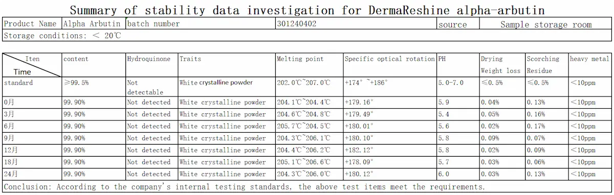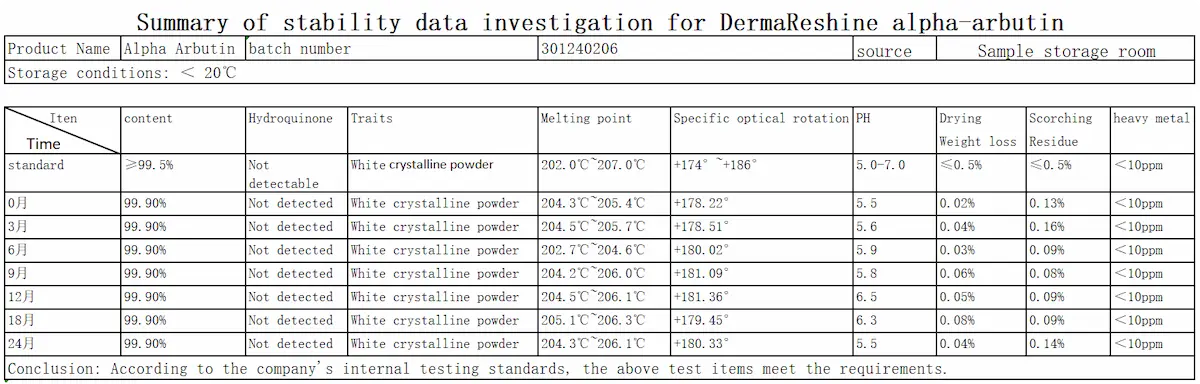 2. Summary of stability study data for Derma Reshine α-arbutin